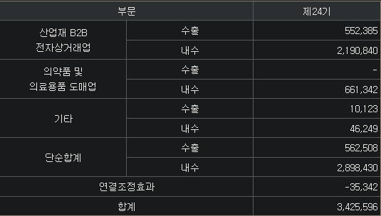 B2B전자상거래(79%, 소모성자재, 자동화설비, 기계부품, 사무용품, 서버, 네트워크장비 등), 의약품&의료용품 도매(20%), 기타(1%) / 거래처 : 삼성계열(삼성전자, 삼성전기, 삼성중공업, 세메스) / 신사업 : 미국진출(21만평 토지매입 for 물류창고)