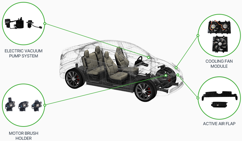 자동차부품 : 공조장치모듈(Cooling Fan Module, Vacuum Pump System, Air Flap), 배터리모듈(Battery Pack, Module Frame, Bus-Bar=전류 전달), 제동장치모듈