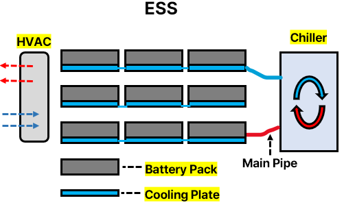 ESS 수랭식 부품 : Chiller(유체 냉각 for 냉각수 방출), Cooling Plate(냉각수 지나가는 길 for 냉각 onto 각 셀), HVAC(공조장치)