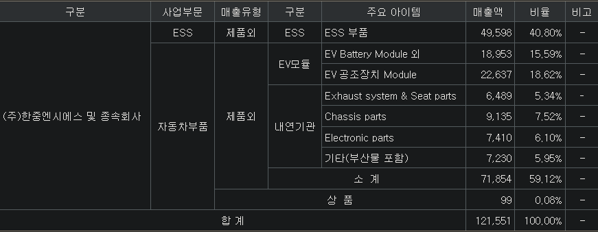ESS 부품(41%, 냉각부품=Chiller, Cooling Plate, HVAC, Pipe, Bus-Bar), EV모듈(34%, HVAC, Battery Pack, Frame, 제동장치), 내연기관용 부품(25%) / 거래처 : 삼성SDI / 리스크 : 내연기관차용 부품(매출25%)