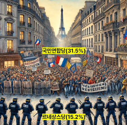- 현 상황 : 24년 6월 총선에서 프랑스 극우정당(국민연합)이 31.5%표를 얻으며, 현 여당인 르네상스당 15.2% 득표대비 압도적 승리. 프랑스하면, '연합', '평화', '친환경' 성격이 강했는데, '자국우선주의', '난민수용철폐' 등의 극우정당 정책이 프랑스 국민들에게 먹힌 것으로 보임. 특히, 젊은층들이 기존 르네상스에서 국민연합당으로 다수 이동. 그 이유는 난민난입과 소득불평등, 고물가 현상으로 극우정당이 포퓰리즘에 표를 던져준 것으로 파악. 출구조사 이후, 마크롱 대통령은 의회해산 명령 후 조기 총선 실시. 대통령의 권한이지만, '모아니면 도' 전략. 조기총선시기는 6.30일, 7.7일이며 의회의석 재선거 시, 극우정당이 다 시 한 번 승리한다면, 유럽연합의 선두주자인 프랑스가 EU에서 리더 자리를 버리고 독자생존으로 갈 가능성 아주 크다고 봄.