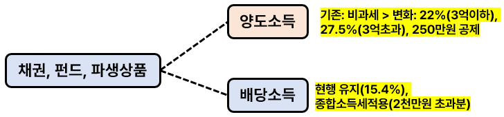 금융투자소득세 : 기존 비과세(주식, 채권, 펀드 양도차익) to 과세(22%, 27.5%)
