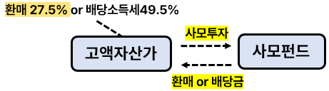 반대론자의 또 다른 입장은 '사모펀드'가 이득을 챙겨간다는 것이에요. 사모펀드는 소수의 자산가들이 돈을 출자하여 전문운용사가 투자를 사적으로 하는 것을 의미해요. 사모펀드는 금융상품에 투자를 해서 얻는 소득을 투자자들에게 '환매' or '배당소득'으로 돌려줍니다. 현재는 주로 배당소득으로 돌려주는데요. 배당소득세는 위에서 언급했듯이 15.4%에요. 다만, 2,000만원이 넘어가면 종합소득세로 누진세가 적용이 되죠. 종합과세의 최고세율은 49.5%로 고액자산가로 이루어진 사모펀드에서는 자주 내는 세금입니다. 반면, 세금을 아끼려고 '환매'방식을 선택할 확률이 아주 높아요. 환매는 한자로 '바꿀 환', '팔 매'란 뜻으로 말 그대로 기존 펀드투자지분율을 판매하여 양도소득을 챙기는 것이에요. 왜 배당소득을 안받고 환매를 하려고 할까요? 그 이유는 간단합니다. 배당소득세는 최고세율이 49.5%, 양도소득세율은 27.5%이기 때문입니다. 환매를 하는 것이 22% 절세를 하는 것이기 때문이죠.