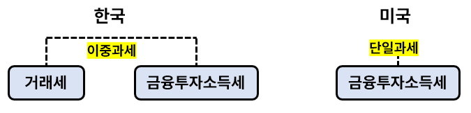 현 거래세는 0.3% to 0.23%(0.15%로 낮추는 중)로 낮아진 상황이에요. 다만, 여기서 주목할 것은 '거래세의 존재'입니다. 미국은 거래세가 존재하지 않아요. 금융투자소득세가 대신 있죠. 반면, 한국은 금융투자소득세가 없고 거래세로 세금을 대신 걷어왔어요. 문제는 거래세가 유지되는 동시에 금융투자소득세까지 과세가 2개가 된다는 것이에요.