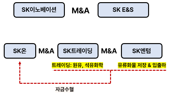 - SK온 합병 : 'SK온+SK트레이딩+SK엔텀' > 영향 : 자금수혈 for SK온