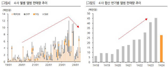 - 의견 : 국내 엔터4사(하이브, 에스엠, JYP, 와이지)의 2Q24 실적발표(YoY)는 모두 컨센 하회. 가장 큰 하락 요인은 '앨범 판매감소'를 들 수 있음. 23년 앨범구매의 비경상적 상승이유로 기고효과가 높아졌기 때문. 다만, 엔터사들의 매출은 앨범, 음원, 공연, MD로 다변화가 되어있음. 문제는 앨범이 총 매출액에서 차지하는 비중이 30~50%로 단일로는 가장 크기 때문에 실적에 크게 영향. 하지만, 음원, 공연, MD 매출의 상승은 꾸준히 우상향 중. 특히, 서양권 K-pop 진출을 눈여겨 봐야함. 스포티파이, 애플뮤직 등 주로 서양사람(미국, 유럽, 남미)들이 듣는 플랫폼임. 아시아권은 이미 K-pop의 내수시장이라고 볼 수 있을 정도로 성숙화 진행 중. 서구권이 마진율이 높고 시장침투율 룸(Room)도 충분한 상황. 스포티파이, 애플뮤직 등의 국내 엔터4사들의 음원청취 등 데이터를 추적하여 엔터성장을 가늠해볼 필요가 있음. 아직까지는 긍정적.