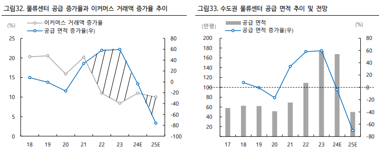 - 의견 : 지산 = 서울+경기권 비중 77%, 공실률 50% 이상 / 물류센터 : 17~22년 평균 공급면적(60만평), 현재 168만평, 23년 이후 인허가x(공급감소)