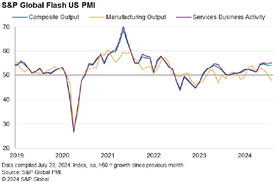 - 의견 : 미국 증시는 9월 Fed의 금리인하가 50bp가 아닌 25bp로 낮출 것으로 예상하여 약세를 기록. 금리인하는 보통 주식시장의 상승을 끌어왔기 때문에 인하폭이 좁기에 실망감을 표출. 25bp 인하 가능성은 '주간 실업청구건수'가 WoW +4,000건에 그침. 즉, 실업자가 소폭증가에 그쳐서 경기양호하다는 것을 증명함. 또한, 종합구매관리지수(PMI, Purchasing Manager Index) 또한 54.1(50이상 경기호황)포인트 기록하면서 뒷받침해줌. 다만, 종합PMI는 제조업PMI, 서비스PMI로 나눌 수가 있는데, 제조업 PMI는 50이하 기록 중. 종합PMI를 끌어올린 것은 서비스PMI로 55.2를 기록하면서, 평균을 끌어올림. 서비스PMI는 고금리에 그나마 견딜 수 있기에 근 2년간 금리상승이 가파름에도 50이상을 상회하는 데이터를 보여줌. 미국 증시는 대선이슈와 경기침체논란이 계속해서 등장할 것이기에 일방향보다는 양방향으로 움직일 가능성이 매우 다분. 현금확보를 하여 방향이 정해졌을 때, 본격적 투자를 해도 늦지않을 것으로 판단.