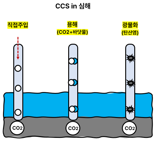 - CCS 종류 in 심해 : 1) 직접주입, 2) 용해(CO2+바닷물), 3) 광물화(탄산염)