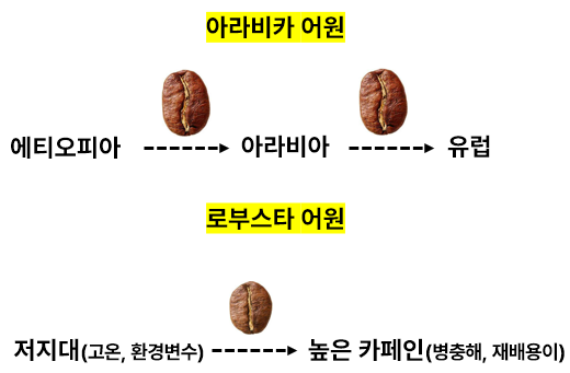 - 요약: 아라비카는 '아라비아'에서 유래했고, 로부스타는 '강건함'을 뜻하는 영어 단어에서 이름이 나왔어요.