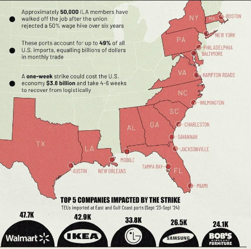 - 미국 동구 항만 파업: 미국 동부와 걸프 지역 항만에서 약 45,000명의 노동자가 파업을 진행 중이에요. 주요 원인은 임금 불만족과 항만 자동화장치 도입에 대한 반발이에요. 노동자들은 임금 인상과 더불어 항만 자동화 제한을 요구하고 있습니다.