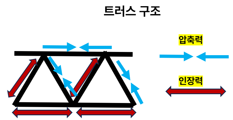 - 트러스 구조: 인장력과 압축력을 삼각형 구조로 효율적으로 분산시키는 구조 방식