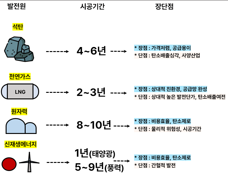 - 전력 공급원 변화: 재생에너지 비중이 증가하면서 간헐성 문제가 대두되고 있으며, 석탄발전은 축소되고 원전 건설에는 장기간이 소요돼요. 이에 반해, 천연가스는 건설기간이 2~3년으로 짧아 단기적으로 전력 수요 대응에 적합한 에너지원으로 부각되고 있어요.