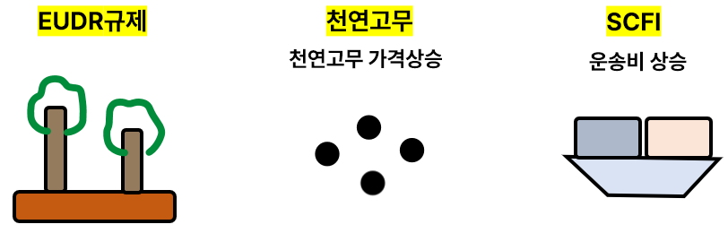 - 재료비 부담: 천연고무와 부타디엔 가격 상승으로 인해 재료비 부담이 커지고 있어요. 특히, EUDR(유럽 지속 가능성 규제) 발효에 따른 천연고무 물량 확보 경쟁이 심화되고 있어 재료비 상승이 지속될 전망입니다.