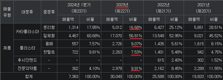 외용제ODM(90%, 카타플라스마74%=파스 for 넓은 부위, 플라스타16%=파스 for 작은 부위), 전문의약품(10%, 고혈압, 당뇨, 소화제, 항생제 등)