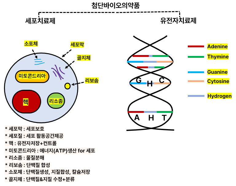 첨단바이오의약품이란 이름 그대로 '최신기술' 바이오의약품이에요. 대표적으로 세포치료제, 유전자치료제 등이 있죠. 첨단바이오의약품은 '첨단'이라는 이름에 걸맞게 타겟팅하는 질병도 '희귀질환'입니다. 예를 들면, 근감소증, 듀센 근디스트로피(유전성 근육약화), 샤르코-마리-투스병(유전성 말초신경병증) 등이 있어요. 첨단바이오의약품인 '세포치료제', '유전자치료제'는 희귀질환에 특화되있을 수 밖에 없어요. 희귀질환이라는 것은 대부분 태어났을 때부터 다른 이들과 다른 '유전자조직', '세포조직'을 갖고 태어나기 때문이에요.