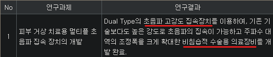 SNS에 수 많은 잘생기고 이쁜 얼굴들이 올라오기에 일반인들 역시 외모에 관심이 증가했어요. 즉, 외모관리수요가 증가했죠. 일반소비자들은 접근성, 비용성 측면을 고려하여 '비침습적' 관리를 선호합니다. 비침습적이란 이름 그대로 피부에 직접 침투하지 않는 것을 의미하는데요. 반대로 침습적 피부관리는 얼굴에 직접 주사, 칼을 갖다대는 것을 의미해요. 효과는 가장 확실하겠지만, 비용성, 접근성에서 부담감이 있죠. 그래서, 데일리 홈케어 제품으로 HIFU 같은 비침습적 피부미용의료기기들의 관심이 증가하고 있어요. 아래 동사의 연구실적을 보면, '초음파 고강도 집속장치(HIFU)'의 주파수를 자유롭게 하여 실제 수술용에까지 쓸 수 있도록 R&D 투자를 한 것을 알 수 있죠. 즉, 비침슴적 피부미용의료기기도 수술용에 쓰일 수 있을 정도로 효과가 올라왔다는 것을 알 수 있습니다.