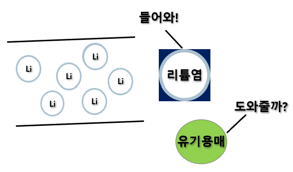 그 다음 유기용매는 간단해요. 리튬이온이 잘 이동하도록 리튬염이 돕는다고 했는데, 유기용매는 이 리튬염을 돕습니다. 리튬염이랑 친하게 지내야하기 때문에, 녹는 의미를 가진 용해도가 높아야겠죠. 또, 리튬이온의 이동경로를 방해하면 안되기때문에 끈적이거나 리튬이 예민한 물 같은 성질도 최대한 덜 가지고 있어야합니다.