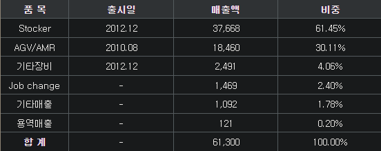 Stocker(61%, '웨이퍼저장용기FOUP' 반입&반출), AGV & AMR(30%), 기타(9%)