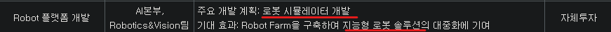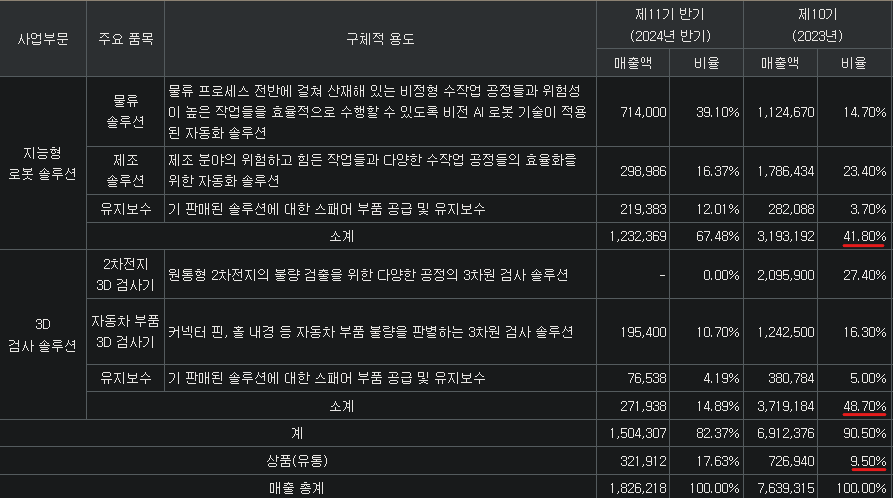 * 유동적 / 제조 & 물류로봇(42%, 제조=로딩&언로딩+디스펜싱, 물류=팔레타이징+피스피킹+보이드필), 3D 검사장비(49%, 원통형 배터리, 자동차부품=커넥터 핀+홀 내경+실란트 등), 기타(9%) / 거래처 : 3D 검사(만도, 현대모비스, LG에너지솔루션)