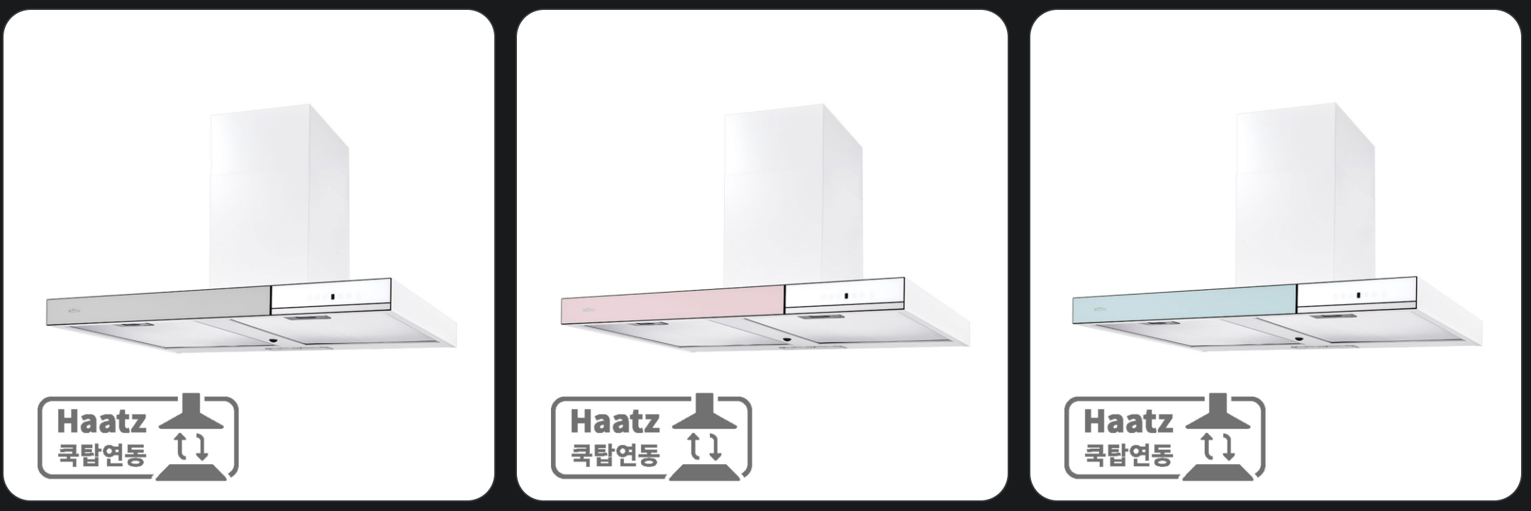 하츠는 레인지후드를 기존 상향배기형에서 '햐항배기형'으로 전환을 하고 있는데요. 상향배기형은 이름 그대로 음식냄새 또는 연기를 위로 흡입하여 배출하는 것을 의미해요. 그러므로 레인지후드가 천장쪽에 달려 있죠. 반면, 하향배기형은 기체를 아래로 잡아 당겨서 배출하는 것을 의미해요.
