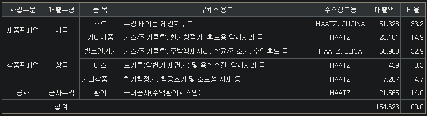 레인지후드(33%, Rangehood), 쿡탑(48%, 가스or전기레인지, 환기청정기, 건조기 등), 주택환기시스템(14%, 환기시스템 설계건축 for 주택), 기타(5%, 소모성 자재) / 모회사 : 벽산(무기단열재 판매)
