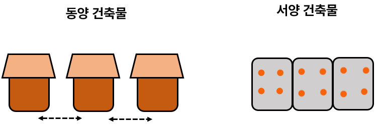 - 동양 건축물 떨어진 이유 : 1) 동양의 농경지 문화(정사각형 선호), 2) 목조건물(화재번짐위험)