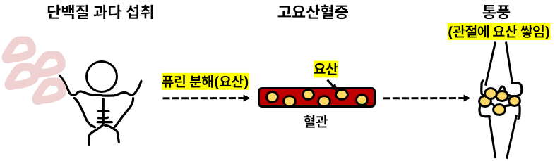 단백질에는 '퓨린'이라는 화합물이 있어요. 퓨린은 요산을 분비하는 역할을 해요. 문제는 요산이 과도하게 쌓이면 관절에 침착되어 통증을 유발한다는 것이에요.