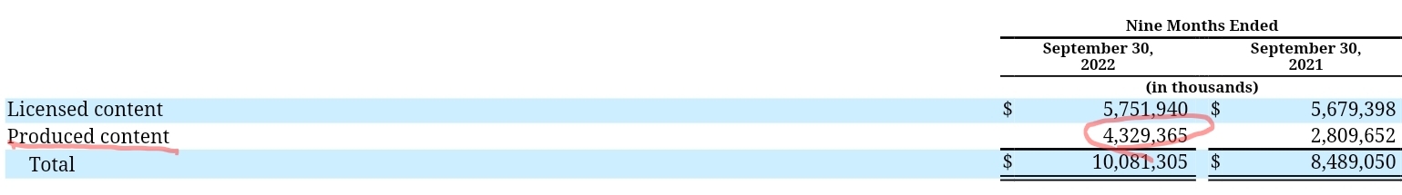 라이센스컨텐츠는 21년 5.6B -> 22년 5.7B(9개월 누적 기준)로 0.1B 정도 증가했어요. 아주 미미하죠. 하지만, 직접생산컨텐츠(Produced content)를 보면 2.8B -> 4.3B로 증가한 것을 볼 수 있습니다. 무려 1.5B증가했으며 53% 증가했어요. 넷플릭스가 얼마나 자사 컨텐츠 투자에 진심인지 알 수 있죠. 다만, 흥미로운 점은 넷플릭스는 M/S 높이기 위해 컨텐츠 물량으로 밀어붙였었는데, 순수제작비의 20~35%를 투자했죠. 하지만, 투자 대비 효율이 떨어진다 생각하여 넷플릭스 경영진은 제작비 비율로 투자하는 것이 아닌 금액을 딱 정해서 투자한다고 선언을 했어요. 앞서 말한 구독자수를 늘리는 전략보다는 비용효율화를 개선하려는 노력을 하고 있는 것이 다시 한번 떠오르네요. 참고로 넷플릭스가 향후 5년 안에 컨텐츠투자계약비용만 21.5B이 잡혀있어요. 원화로 28조원이니 어마어마한 컨텐츠투자비용이죠.