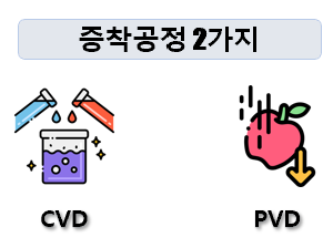 이 박막은 굉장히 얇아요. 1μm(100만분의 1) 이하의 정말 얇은 막이죠.이 얇은 박막을 씌우는 방법은 두 가지가 있는데요. 역시나 여기서도 물리적증착방식과 화학적증착방법이 쓰이죠. 사실, 수증기를 사용하기 때문에 '기상'이라는 단어를 추가해서 물리적 기상증착방법(PVD, Physical Vapor Deposition), 화학적 기상증착방법(CVD, Chemical Vapor Deposition)이라 하죠.
