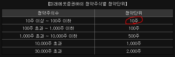 최소 청약단위는 10주부터 시작입니다. 많은 분들이 헷갈려하는 것 중에 99주를 넣으면 10주보다는 더 받을 가능성 있지 않겠냐는 질문이 많아요. 아래 표를 보듯이, 10주이상~100주 이하는 똑같습니다. 10주나 99주나 같은 바운더리안에 있기때문이죠. 10주보다는 더 넣고 싶다고 하면 100주 초과인 101주 이상을 넣어야 합니다.