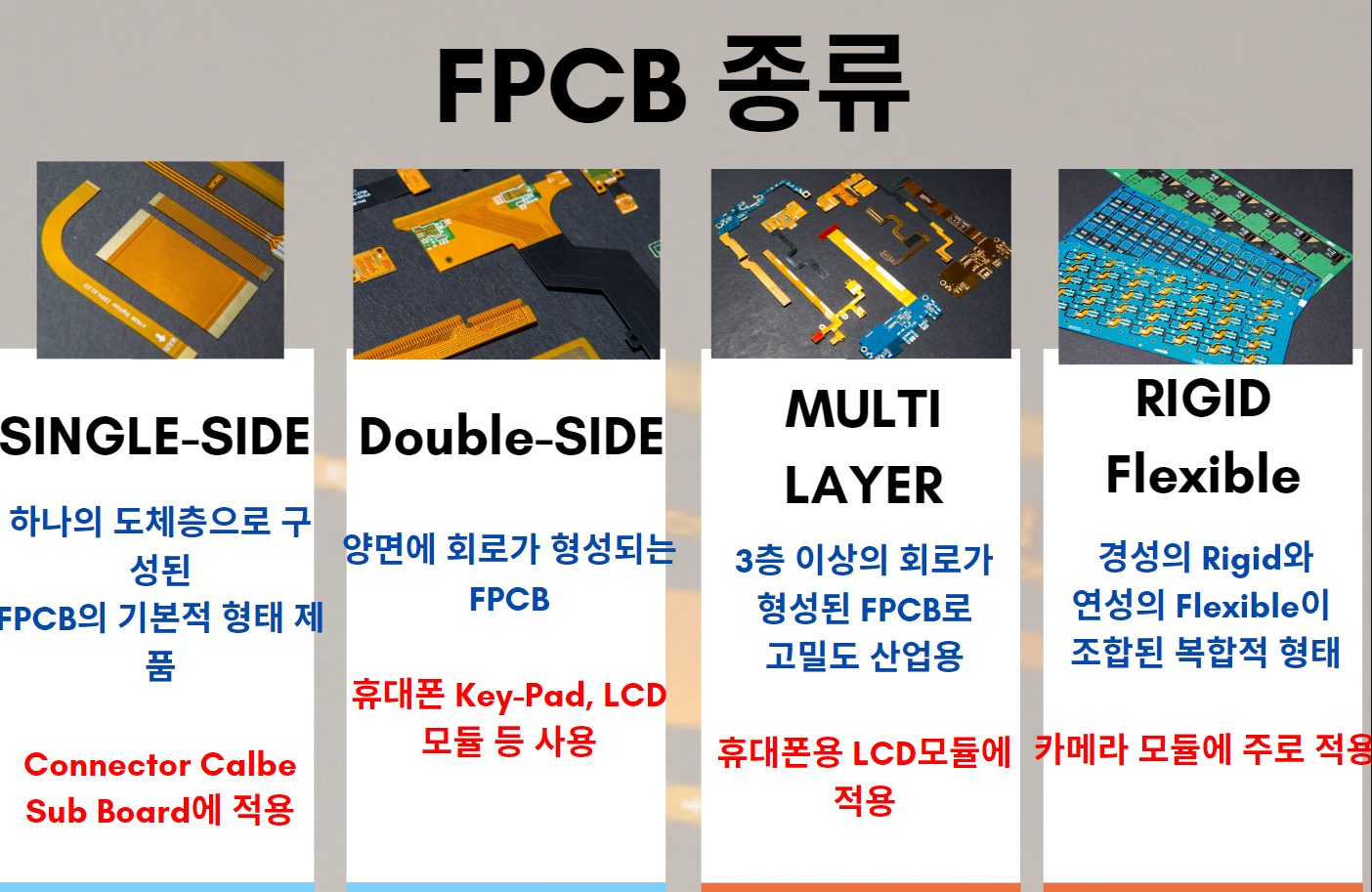 이 FPCB도 종류가 있어요! 첫번째로 SINGLE-SIDE 하나의도체층으로구성된가장기본적형태의제품으로주로 Connector Cable 및 Sub Board에적용되요.다음~ Double-SIDE 말그대로양면에회로가형성되는 FPCB로주로휴대폰 Key-Pad, LCD 모듈등으로사용되고 있어요. ('다음은 예상되시죠?') MULTI LAYER입니다. 3층 이상의 회로가 형성된 FPCB로, 고밀도화 및 고기능화에 따른 고밀도 산업용 FPCB의 필요성에 대응하기 위한 제품이에요. 주로 휴대폰용 LCD 모듈에 사용되요! 마지막으로 RIGID Flexible 이것은 일반적 다층기판과는 달리 경성의 Rigid 와 연성의 Flexible이 조합된 복합적인 형태로, 기존FPCB보다 한발 나아간 형태의 기판이에요 주로 카메라 모듈에 사용되고 있으며, 우주항공, 군사, 의료 분야에도 적용되고 있어요!