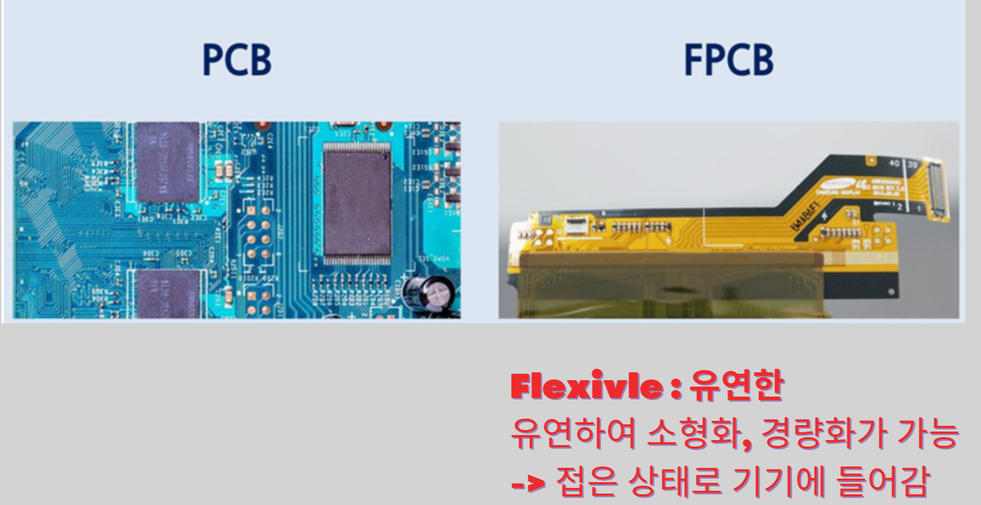 Flexible Printed Circuit Board 로 Flexible 즉 유연한 PCB(인쇄회로기판)에요('유연함이 무슨말이냐?'). 말 그대로 PCB에 유연함을 추가해서 소형화, 경량화가 가능하고 구부러지기도 해요, 주로 스마트폰 있죠? 스마트폰의 경우 휴대를 고려해야해서 크기를 최소화시켜야해요. 그렇기때문에 주로 FPCB를 접어서 넣는답니다~ FPCB도 PCB랑 다르지 않아요. 전자기기의 AP가 명령하는 신호를 DDI(디스플레이 드라이버)로 보내는 전달자 역할이 핵심!이죠. 요즘 기능은 디폴트로 가져가고 더 가볍고 더 뛰어난 디자인이 중요하잖아요? FPCB가 점점 활용도가 높아지는 이유랍니다~(주재료는 CCL(FPCB Base Film)과 CL(절연용도) )