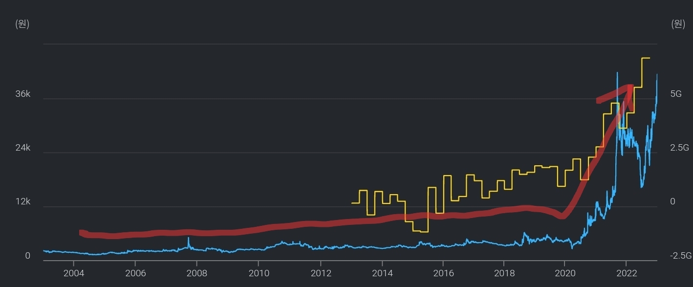 15년 이상 주가 제자리였던 것이 2차전지시장 관련주로 묵이면서 주가 고공행진