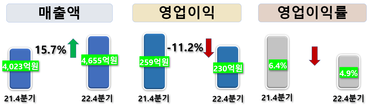 한국콜마의 예상 잠정실적은 다음과 같아요. 매출액은 15.7% 상승하는 것으로 보이는데, 영업이익과 영업이익률이 하락하는 것을 알 수 있습니다.