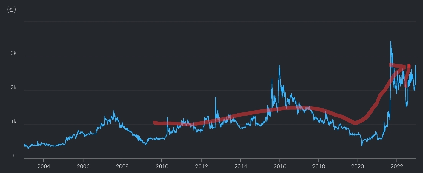 계속된 적자와 전환사채로 인해 주가 하락하다가 20년 이후 2차전지시장이 커지자 주가 고공행진 중 :