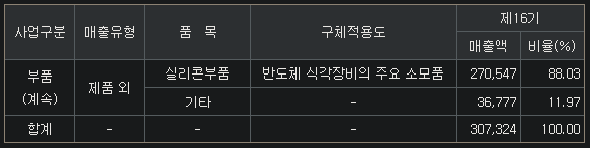 · (핵심사업!!) 실리콘 부품(Electrode, Ring 건식식각장비업체에 납품) : 실리콘(Si), 실리콘카바이드(SiC, 반도체 에칭, 증착에 사용) + 파인세라믹 / 원재료 : 폴리실리콘, 단(다)결정Ingot / 반도체 장비업체에 부품판매