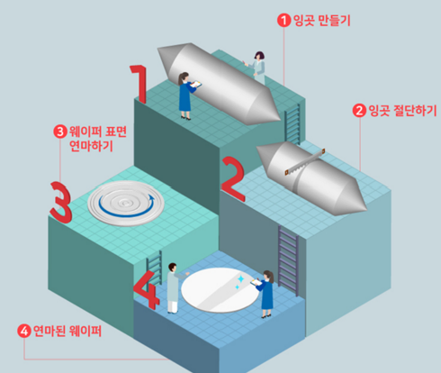 웨이퍼 만드는 제조공정을 보면 더 쉽게 이해가 가능한데요. 실리콘 결정들을 잘 모아서 하나의 덩어리(=잉곳)로 만들어요.그리고 앞서 설명했듯 잘게 절단을 하죠. 그러면 웨이퍼모양이 나올텐데, 표면이 매끄럽지 못하겠죠. 표면을 매끄럽게 하기 위해 연마(=polishing)를 해줍니다. 그러면, 웨이퍼제조가 완성이 되는 것이죠.
