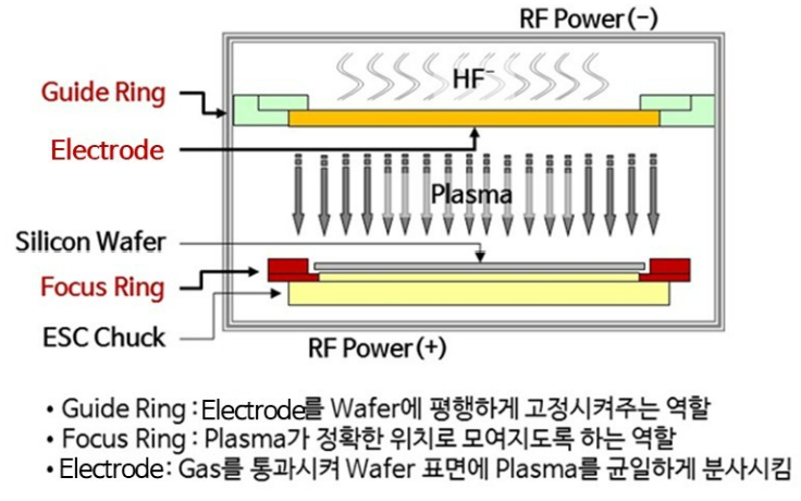 · Ring : 챔버(Chamber)내에서 플라즈마가 정확한 위치로 모여지도록 하는 역할 + Electrode를 웨이퍼에 평행하게 고정시켜주는 역할