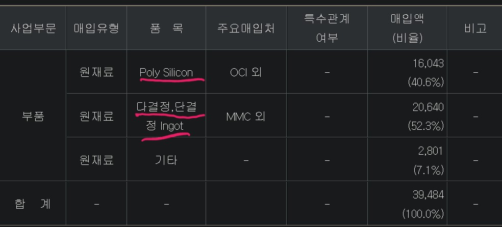 하나머티리얼즈의 주 원재료는 폴리실리콘과 잉곳이에요. 잉곳이 좀 더 많은 매입액 비중(52.3%)을 차지하고 있죠.