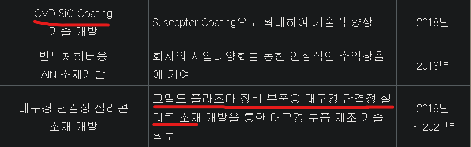 2020년 2월 반도체소재인 특수가스부문을 솔머티리얼즈에 143억원을 주고 넘겼고요. 현재는 반도체부품인 실리콘부품(Si, SiC)과 파인 세라믹을 공급하고 있습니다.