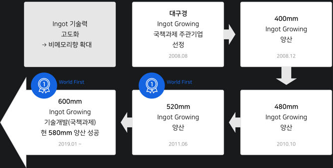 참고로 웨이퍼가 넓어질 수록 반도체회로를 더 많이 새길 수 있겠죠. 국가에서 국책과제로 내세울 정도로 웨이퍼크기의 중요성을 느낄 수가 있는데요. 현재 600mm(지름60cm)를 목표로 580mm까지 개발에 성공한 것을 알 수 있습니다.