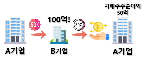 그렇다면, 비지배순이익은 뭘까요? 비지배순이익은 B기업이 100억원 중 50억원을 A기업에 주었잖아요? 그러면 50억원이 남죠. 이것은 B기업의 주주들 것입니다. 이게 비지배순이익입니다.