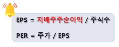 여기서 잠깐! 뭔가 이상하지 않았나요? 실컷 지배주주순이익을 이해해놓고 사용하지 않았다는 것을요? 맞습니다. 지배주주순이익을 통해서 구하는 것이 이 기업의 정확한 PER을 구하는 방법입니다.