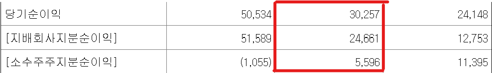 전자공시시스템에 들어가면 아래와 같이 A라는 기업에 대해 지배회사지분순이익과 비지배지분순이익(소수주주지분순이익)으로 나뉘어요.