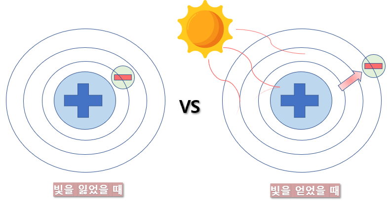 원자의 속성을 알면 더 이해하기 쉬운데요. 원자는 원자핵과 전자로 이루어져있죠. 원자핵은 +극, 전자는 -극입니다. 이때, 전자의 역할이 중요한데요. 전자가 빛을 잃으면 원자핵에 가까워지고, 빛을 얻으면 원자핵과 멀어집니다. 2차전지에서도 배웠듯이(2차전지배터리 참고) 전자인 -극이 +극으로 이동하면 방전을 하는 것과 똑같은 원리입니다.