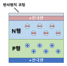 태양전지는 전자를 끌어들이는 성질을 가진 P형 반도체와 전자를 밀어내는 성질을 가진 N형 반도체가 만난 형태에요. P형은 +극, N형은 -극이라고 이해하면됩니다.