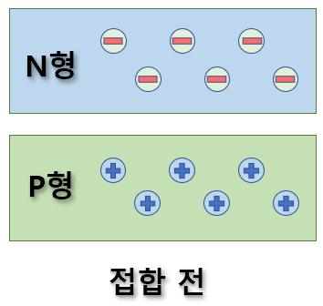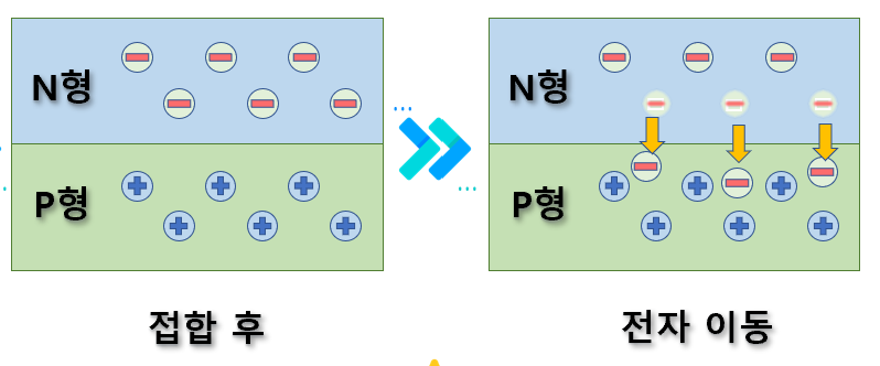 이 P형(+)과 N형(-)이 만나면 -극인 전자들이 +극인 P형으로 옮겨갑니다. 이때, P형반도체는 전자(-)가 많아졌음으로 -극으로 변하겠죠. 반대로, N형은 전자를 많이 잃었기 때문에 역으로 +극으로 변하게됩니다.
