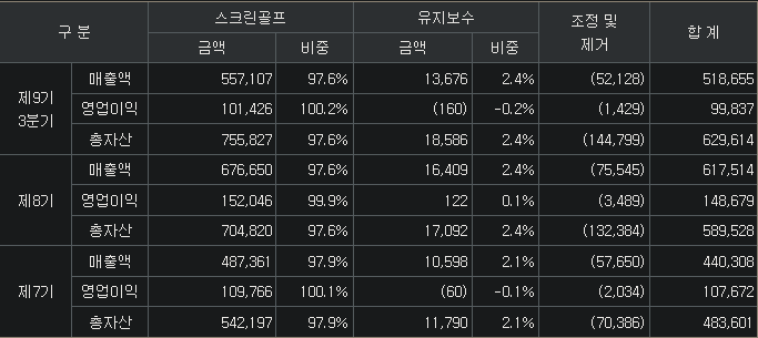 스크린골프(98%, S/W, H/W, 직영사업, 광고, 기타부품), 유지보수(2%)