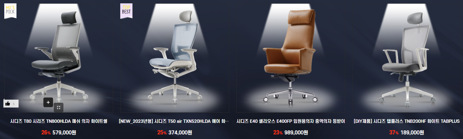 시디즈의 상품은 1백만원 이상의 가격대도 많지만 주로 10만원 후반~100만원 미만의 제품이 주요 제품이고 이 바운더리안에 있는 가격대의 의자들이 베스트셀러다.